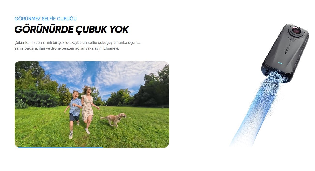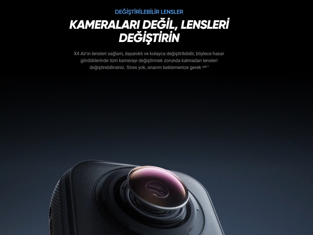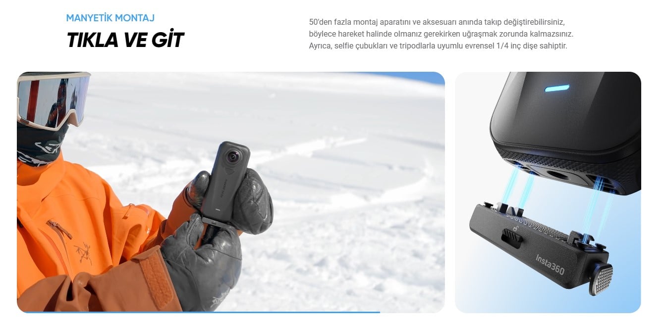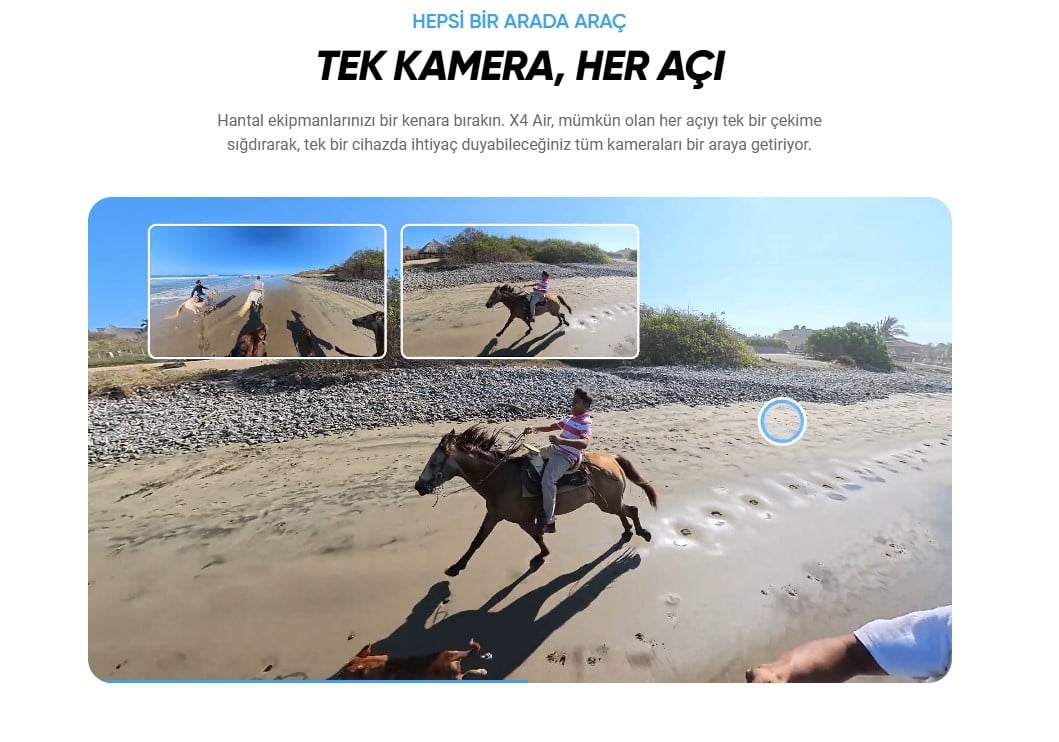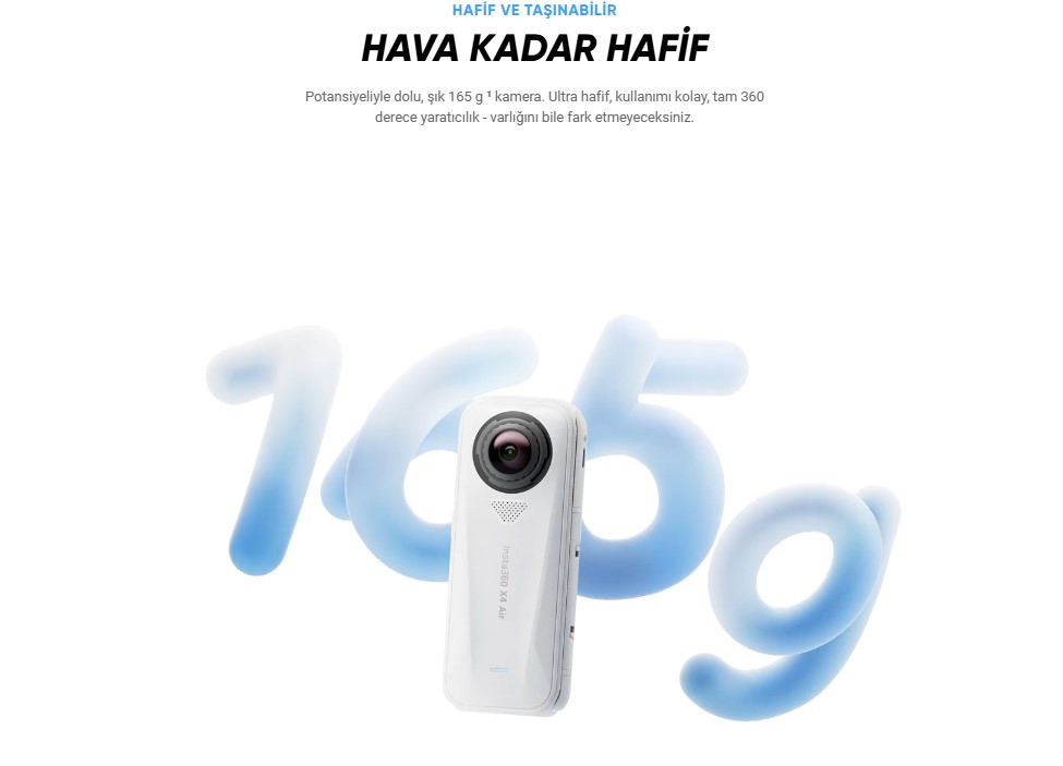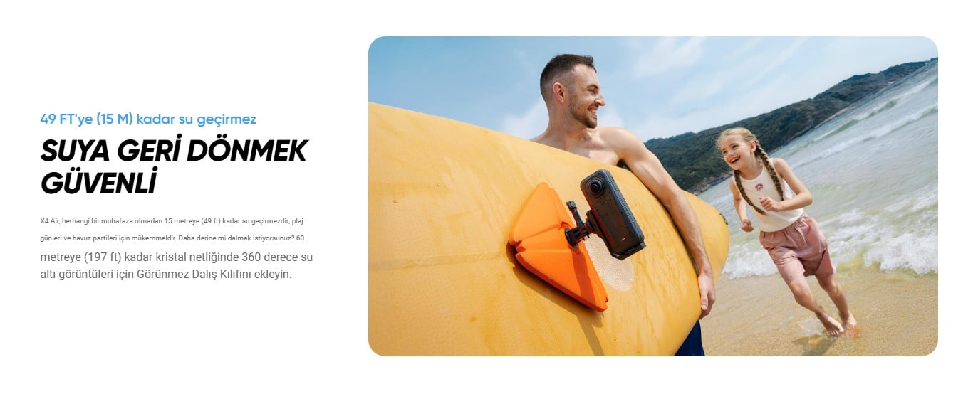 Açıklama: Ultra kompakt Insta360 X4 Air 360° Aksiyon Kamerası Standart Paketi ile sinematik 360° videolar çekin . Çift veya tek lensli modlarda 8K30 360° video çekimi yapabilen bu taşınabilir aksiyon kamerası, X4 kameradan daha küçük ve daha hafiftir. X4 Air, sağlam bir tasarıma sahiptir ve 49' derinliğe kadar suya dayanıklıdır.